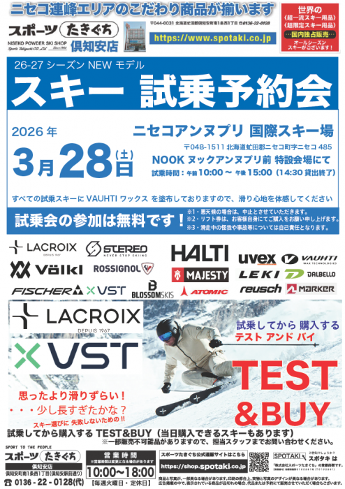 3/28 スポーツたきぐち試乗会 2026.03.09 毎年楽しみにされている方も多い、スポーツたきぐちさんの試乗会が、今年も開催!!日時:3月28日(土)場所:NOOKアンヌプリ前時間:10:00~15:00(最終貸出14:30)LACROIXスキーも試乗可能。こだわりの商品を試乗しましょう。 戻る
