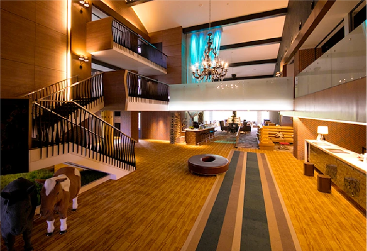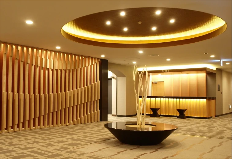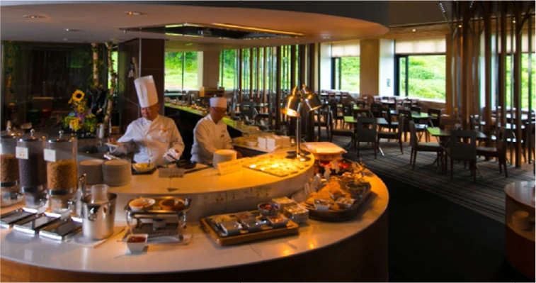 正面玄関を抜けると目の前に高く吹き抜けた空間にたたずむシャンデリアはちょっと上質な大人の装いでお出迎え致します。また、メインダイニング「フュージョンレストラン エクラ」では、焼きたてパンや常時30品以上の料理をビュッフェ形式でお楽しみいただけます。