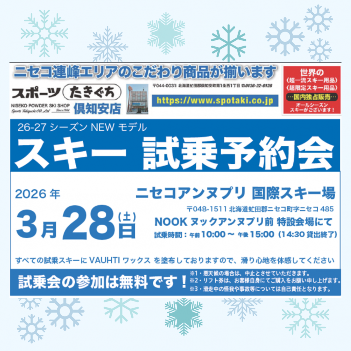 3/28 スポーツたきぐち試乗会 2026.03.09 毎年楽しみにされている方も多い、スポーツたきぐちさんの試乗会が、今年も開催!!日時:3月28日(土)場所:NOOKアンヌプリ前時間:10:00~15:00(最終貸出14:30)LACROIXスキーも試乗可能。こだわりの商品を試乗しましょう。 戻る
